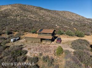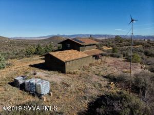 Description: Very unique one of a kind property with a cement block cabin, 2bedroom, 1 bath completely off the grid home back in the Bradshaw Mountains in the middle of BLM Land. Additional storage attached to the house with double doors for easy storage. Tack room and horse pen within sight of the main house and still plenty of room to roam with horses, all-terrain vehicles etc. This home is completely off the grid, it has a refrigerator on propane and water from a mine shaft to a holding tank, wind generator, and solar panels for electricity. With the property on 61.98 acres it has views that do not stop and mountains at every turn.